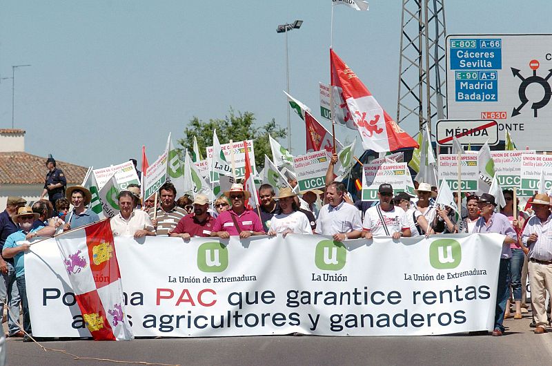 Los ministros de Agricultura de la UE visitan la dehesa durante la reunión informal que se celebra en Mérida y, al mismo tiempo, cientos de agricultores y ganaderos se manifiestan contra las políticas europeas