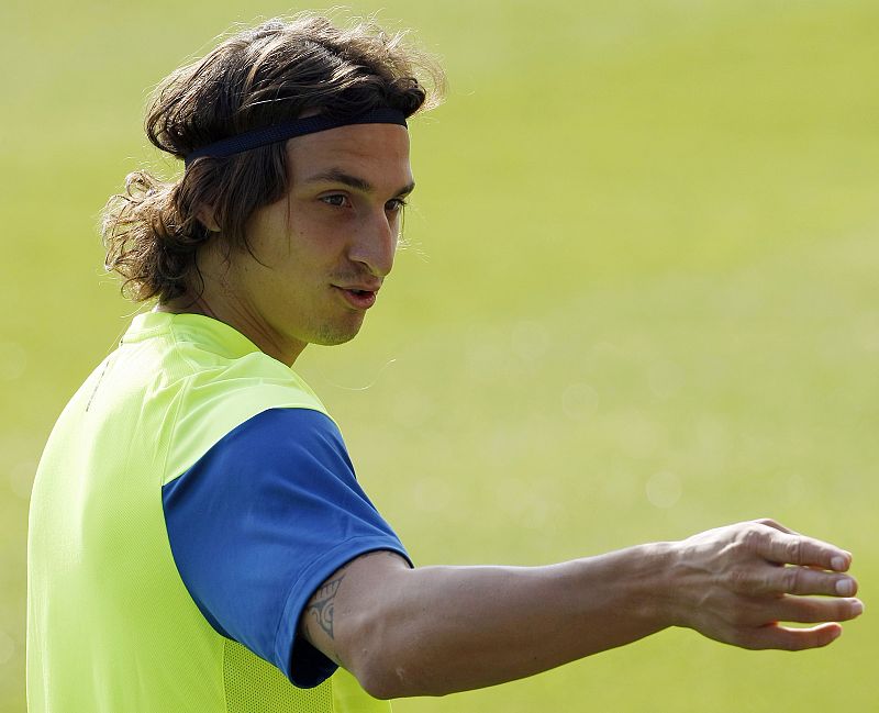 Ibrahimovic ha entrenado por primera vez con sus nuevos compañeos desde que se operó de la mano (03/08/2009).