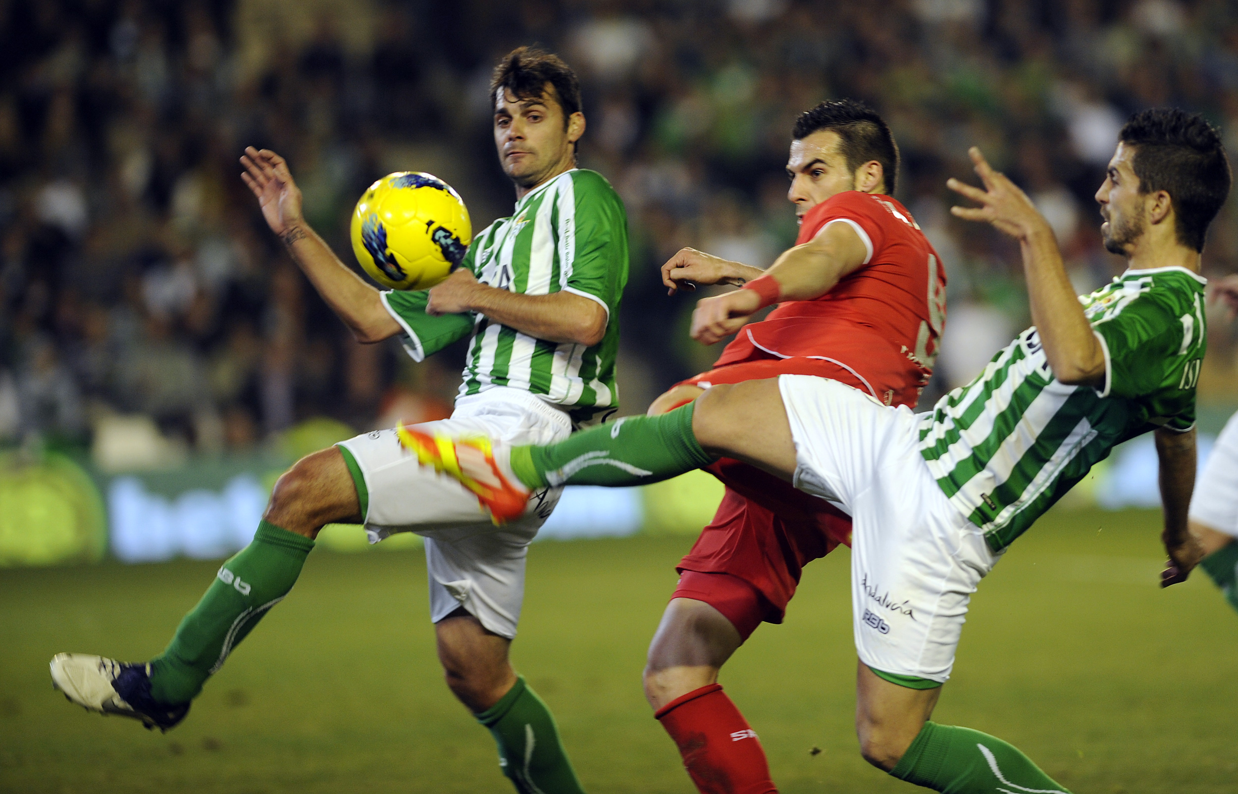 Los de Marcelino buscaron a su punta de referencia, Álvaro Negredo, que dispuso de hasta tres ocasiones claras en los primeros seis minutos de partido. La primera, al ganar la espalda a la adelantada defensa bética, se marchó alta gracias a una providencial mano del meta Casto, en la primera intervención de su recital bajo palos; la segunda, a punto estuvo de sorprender al meta tras un fallo de Cañas; y la tercera, muy desviada, llegó en un remate que culminó un ataque comandado por Trochowski.