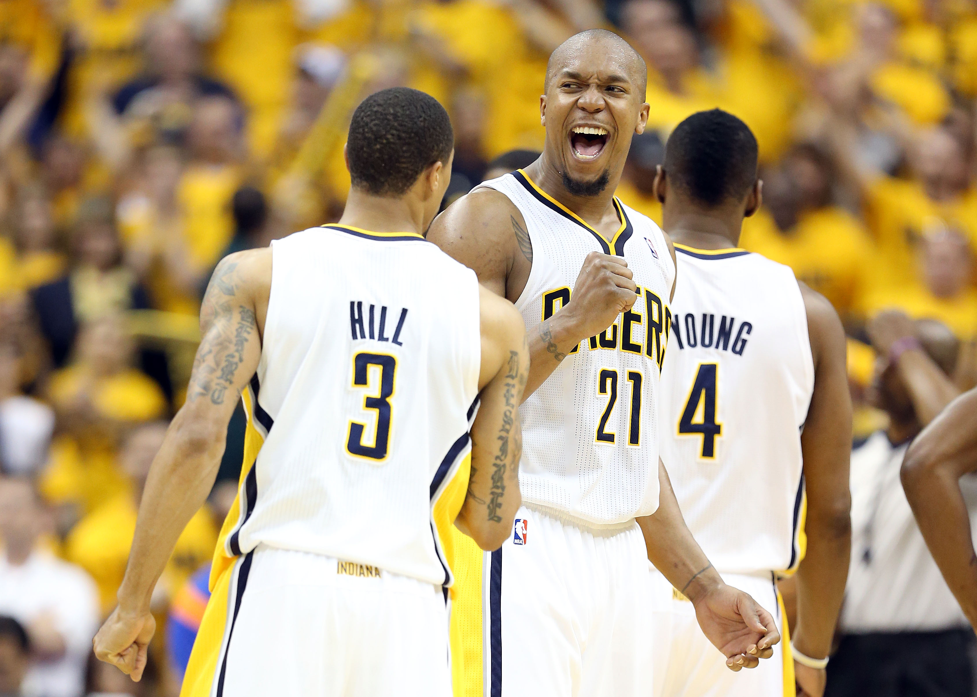 El ala-pívot David West anotó 17 tantos y el base George Hill, que fue duda hasta horas antes del partido al estar recuperándose de los efectos de una conmoción cerebral, que le impidió jugar el quinto, anotó 12 (2-10, 1-6, 7-7), incluidos cuatro desde la línea de personal que aseguraron la victoria en el último minuto del tiempo reglamentario. Hill, con 57 segundos para concluir el partido, anotó el parcial de 103-97 y a falta de 39 puso el 105-99 que ya sería imposible de superar por los Knicks, que fallaron dos intentos de triples, mientras que el alero reserva Sam Young, también desde la línea de personal logró el definitivo 106-99.