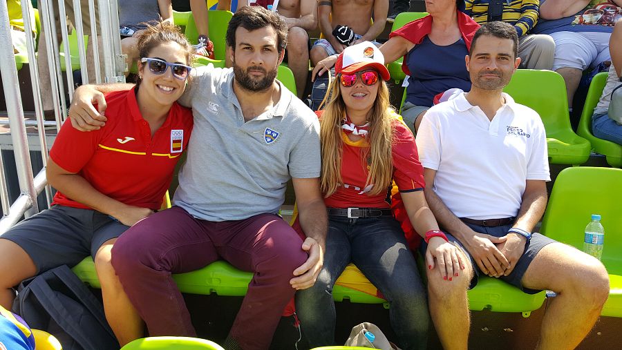"Allez les bleus! Allez les bleus!". Los aficionados -las aficionadas- franceses son mucho más numerososo y ruidosos que los españoles. Entre estos, la mujer del cocinero de la delegación española con sus hijos o Lourdes Alameda, una de las dos suplentes que han acompañado al equipo a Río en caso de que alguna de las seleccionadas cause baja. Con ella está Guillermo, novio de una de las leonas, Marina Bravo, y Marta Lliteras, exjugadora de la selección que ahora trabaja con la Fundación Pedro del Barco para sacar de la exclusión a jóvenes a través del deporte.