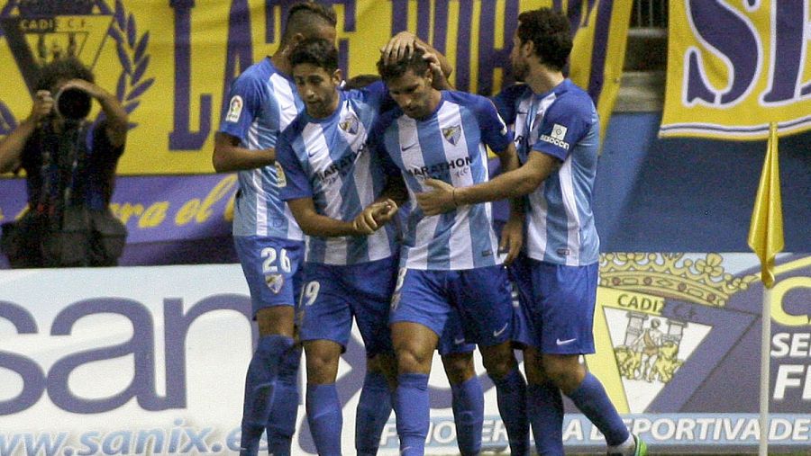 Los jugadores del Málaga celebran el gol marcado por Adrián. Román Ríos