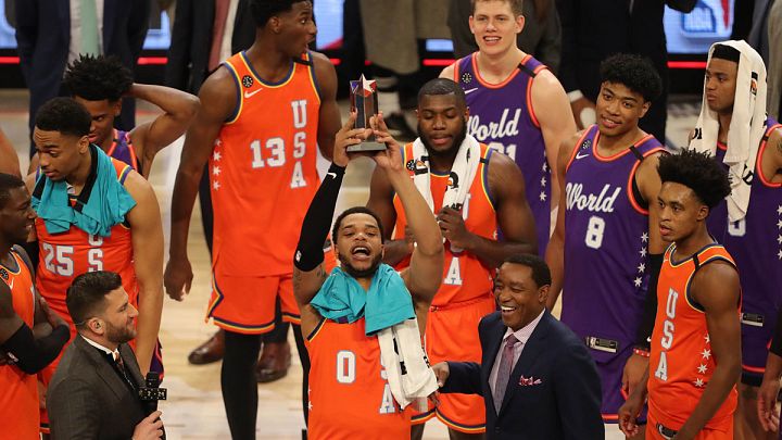El jugador estadounidense Miles Bridges de los Charlotte Hornets sujetando el trofeo del l Rising Stars Challenge. Dennis Wierzbicki-USA TODAY Sports