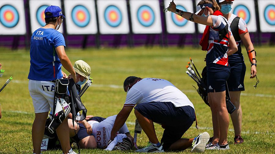 La atleta rusa Svetlana Gomboeva, miembro del equipo del Comité Olímpico Ruso (ROC), ha tenido que recibir atención sanitaria en el campo de Yumenoshima al desmayarse por un golpe de calor durante la ronda de individual femenina de Tiro con arco.