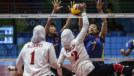 La jugadora iraní Zeinab Maleki ataca ante el bloqueo de las jugadoras chinas