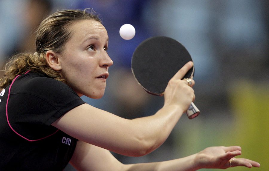 La croata Sandra Paovic en acción en tenis de mesa individual femenino de los Juegos Olímpicos de Pekín 2008