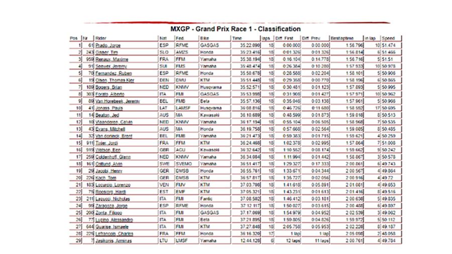 Jorge Prado (RedBull GasGas Factory Racing) ha liderado la primera manga del Gran Premio de Lombardía de MXGP desde la primera curva, donde ha conseguido un nuevo holeshot. El tercero de la temporada después de los dos en Matterley Basin. Durante toda la carrera ha tenido detrás a Tim Gajser, pero el esloveno ha sido incapaz de acercarse a menos de un segundo de Prado y en ningún momento ha encontrado la oportunidad de adelantar al español.