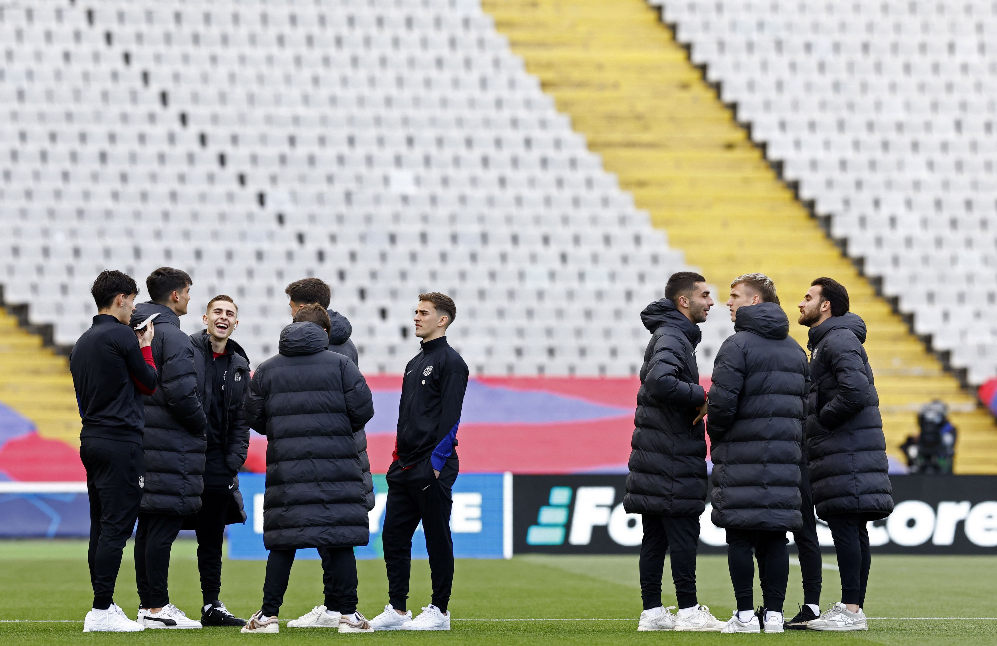 Los jugadores han acabado el calentamiento y se han retirado a los vestuarios para ultimar los preparativos. A pesar de la humedad, el Barcelona ha puesto los aspersores en el césped.