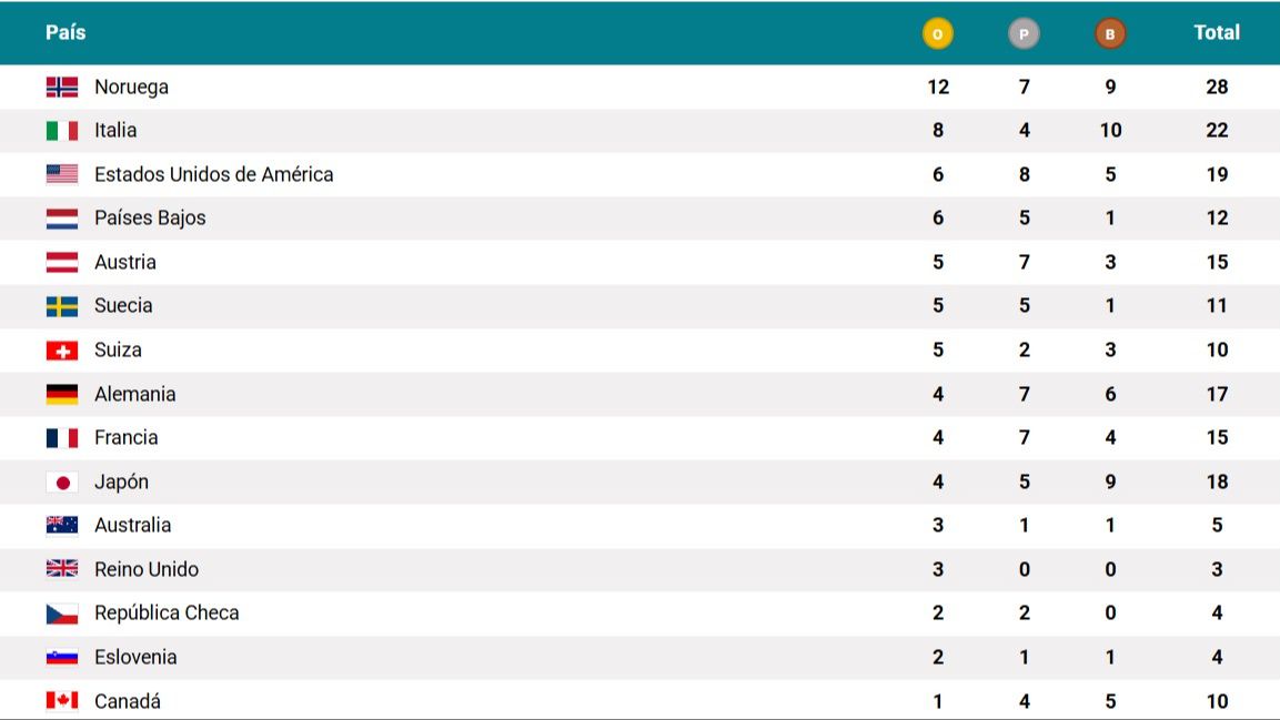 Noruega lidera el ránking con 28 preseas: 12 oros, 7 platas y 9 bronces.