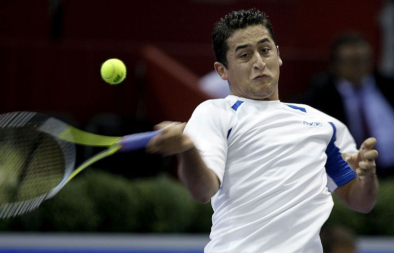 13.10.2008El tenista español Nicolás Almagro devuelve la bola durante su partido contra el italiano Simone Bolelli correspondiente a la primera jornada del Masters Series Madrid 2008.EFE/Ballesteros