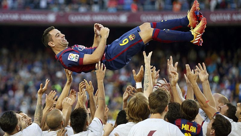 Xavi Hernández, manteado por sus compañeros en su despedida