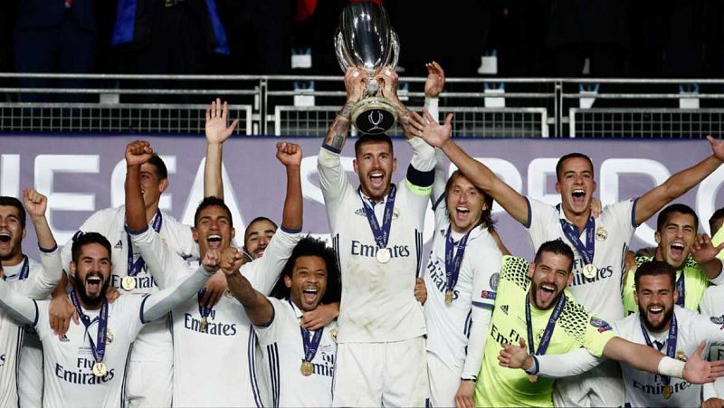 26.12.2016ElReal Madridse ha impuesto al Sevilla 3-2y se ha hecho con la Supercopa de Europa, el primer título oficial de la temporada, gracias a los goles de Marco Asensio, Sergio Ramos y Dani Carvajal, este último en el minuto 119 de la prórroga. Elvigente campeón de la Liga de Campeonesha logrado remontar el partido y ha vuelto a dejar al equipo andaluz, que llegó a ir ganando con los tantos de Franco Vázquez y Konoplyanka,sin trofeo por tercer año consecutivo. (09/08/2016)EFE -