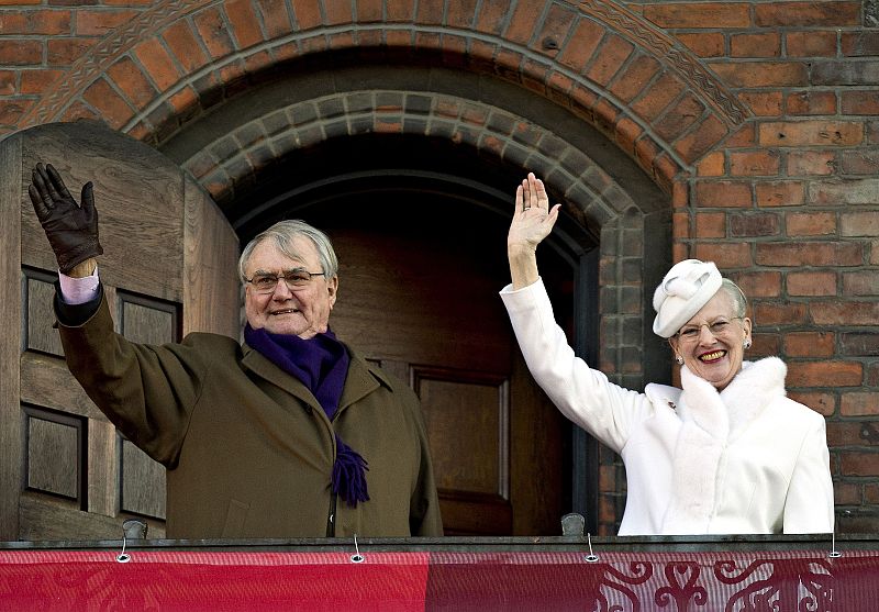 14.01.2012Danish Queen Margrethe (R) and Prince Consort Henrik waves from the balcony of the City Hall on January 14, 2012 on the occasion of Danish Queen Margrethe's 40th jubilee. Danish Queen Margrethe II celebrates 40 years on the throne today, marking the decades-long transformation of a shy artist and heavy smoker to become Europe's most popular monarch. AFP PHOTO/ SCANPIX/ NILS MEILVANG ***DENMARK OUT***AFP PHOTO/ SCANPIX/ NILS MEILVANG -