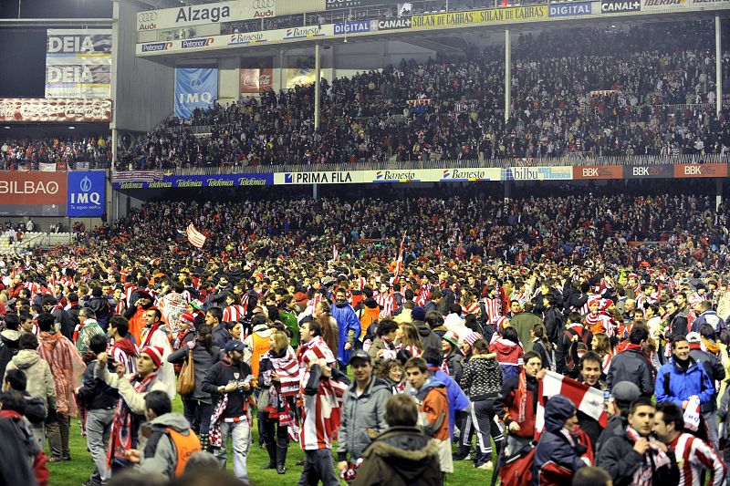 05.03.2009BIL20. BILBAO, 04/03/09.- La afición del Athletic de Bilbao ha invadido el terreno de juego tras finalizar el encuentro de semifinal de Copa del Rey en el que ha vencido por tres goles a cero al Sevilla. EFE/MIGUEL TOÑAEFE/MIGUEL TOÑA