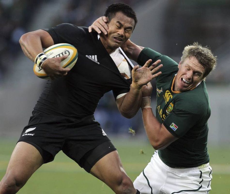24.05.2017Isaia Toeava (L) de losAll Blacks of New Zealand es blocado porJean de Villiers (R) en el Torneo Tres Naciones disputado en Port Elizabeth en 2011.JH sam