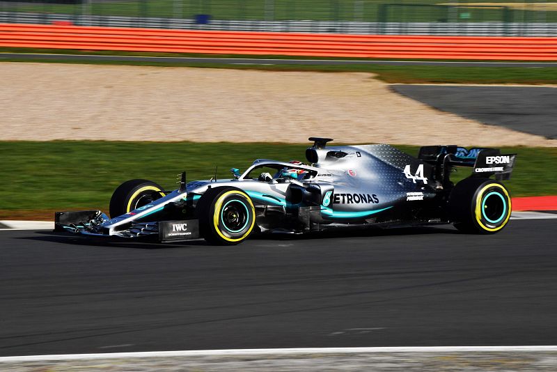 18.02.2019El equipo Mercedes defiende título de pilotos y constructores con el W10, con el que Lewis Hamilton practica en Silverstone en la imagen. -