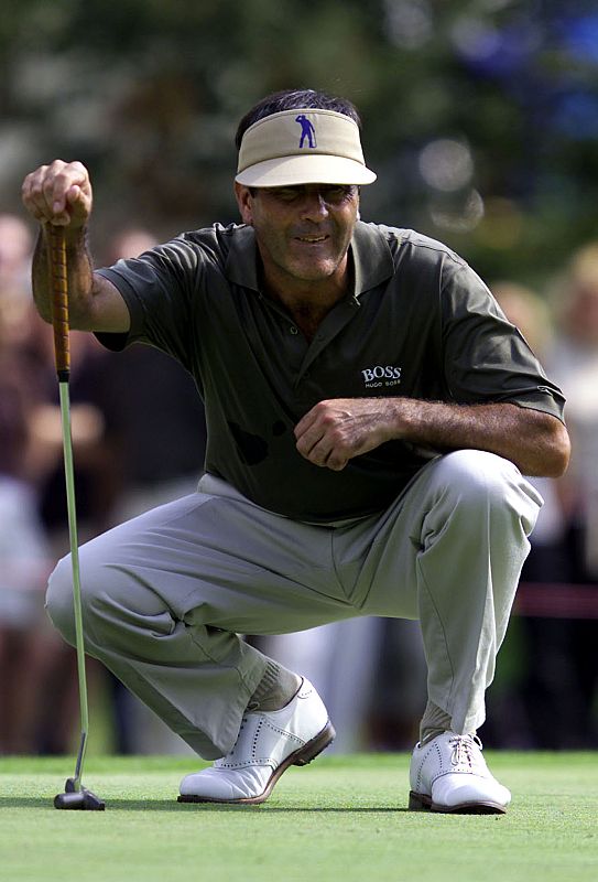 Esta es otra de las características poses que Severiano Ballesteros había repetido miles de veces durante su vida profesional, en cuclillas estudiando un 'green'. En esta ocasión durante el primer día del Torneo Lancome Trophy de París, el 14 de septriembre de 2000.