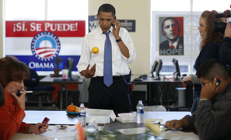 Barack Obama llama por sorpresa a los electores desde las oficinas de la campaña demócrata en Kansas City (Misuri, 18/10/08)