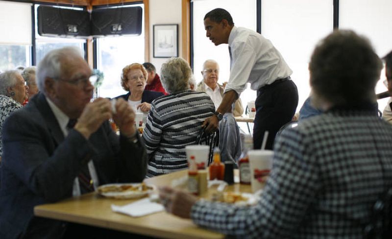 Barack Obama saluda a gente mayor en un restarante en Fayetteville (Carolina del Nortem 19/10/08)