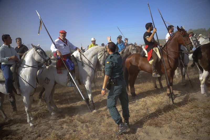 11.09.2012A Spanish civil guard gives instructions to men riding horses during the 'Toro de la Vega' festival, on September 11, 20112 in Tordesillas. The festival is one of the oldest in Spain with roots dating back to the fifteenth century. The bull has to be enticed across the river from the village to the plain 'Vega' before it can be killed to honour the 'Virgen de la Pena'.AFP PHOTO / Pedro ARMESTRE -