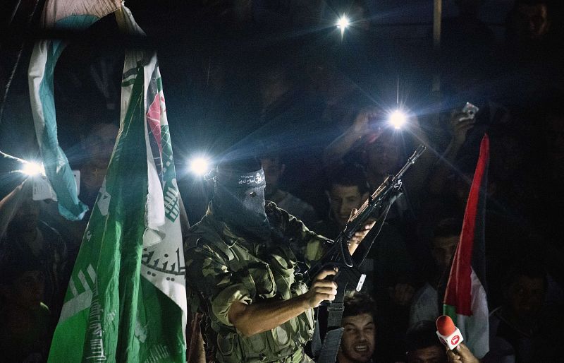A Hamas militant brandishes his weapon as he fires rounds into the air after joining hundreds of Gazans gathered at an intersecition in Gaza City on August 26, 2014 to celebrate a ceasefire agreement reached between Israel and Hamas. Egypt said on Tuesday that a Gaza ceasefire that went into force at 1600 GMT provides for an immediate opening of Israeli border crossings to aid and reconstruction supplies. AFP PHOTO/ROBERTO SCHMIDT