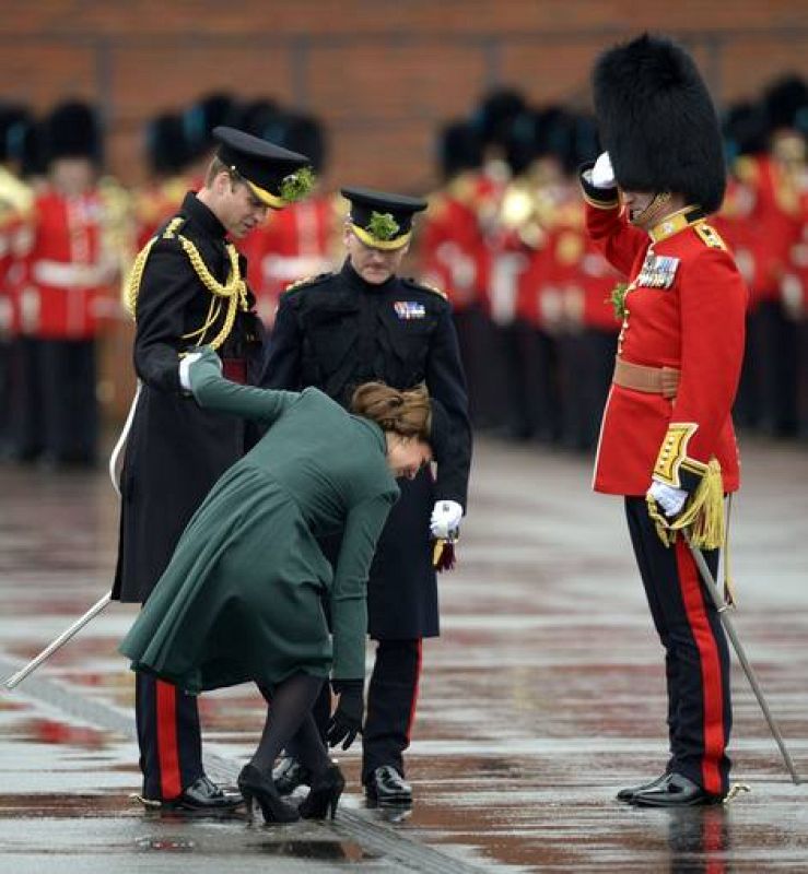 Britain's Catherine, Duchess of Cambridge, holds on to Britain's Prince William, Duke of Cambridge, as she tries to release her shoe that was stuck in the grate during St Patrick's Day parade in Mons Barracks in Aldershot on March 17, 2013. The Duke of Cambridge attends the Parade as Colonel of the Regiment and Catherine presents the traditional sprigs of shamrocks to the Officers and Guardsmen of the Regiment. AFP PHOTO/ADRIAN DENNIS