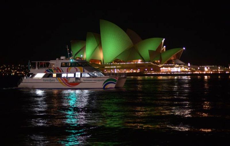 A boat sails past Australia's iconic Sydney Opera House (C) as it stands lit with green lights to mark St Patrick's Day in Sydney on March 17, 2013. From Egypt's pyramids to the Sydney Opera House, some 70 global landmarks will be bathed in green light in honour of Ireland's national day, while in Dublin itself, more than half a million people were expected to line the streets on March 17 for a colourful annual parade. AFP PHOTO / Saeed Khan