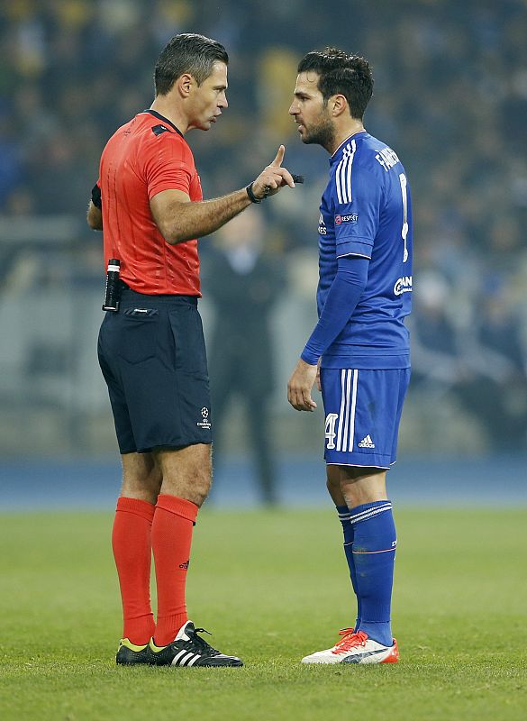 Cesc Fàbregas, del Chelsea, discute con el árbitro del partido ante el Dinamo de Kiev