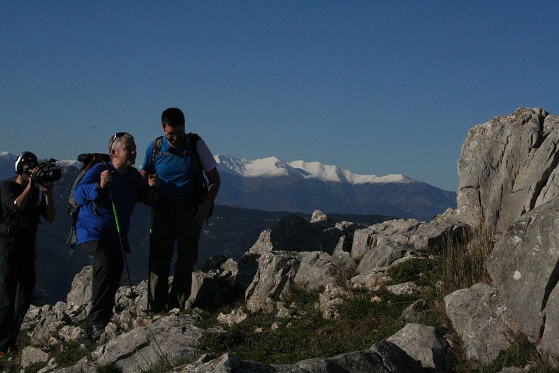 El Màrius Serra arriba al cim del Mont (1.123m) amb el Canigó nevat al fons