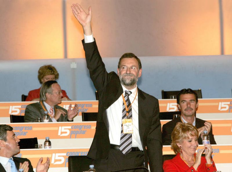 19.06.2008Rajoy saluda a los compromisarios del XV Congreso junto a Acebes y Aguirre, en 2004.ARCHIVO PP