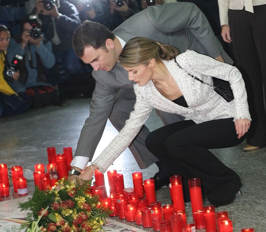 SPANISH CROWN PRINCE FELIPE AND HIS FIANCEE LETIZIA VISIT MEMORIAL FOR VICTIMS OF TRAIN BOMBINGS IN MADRID.