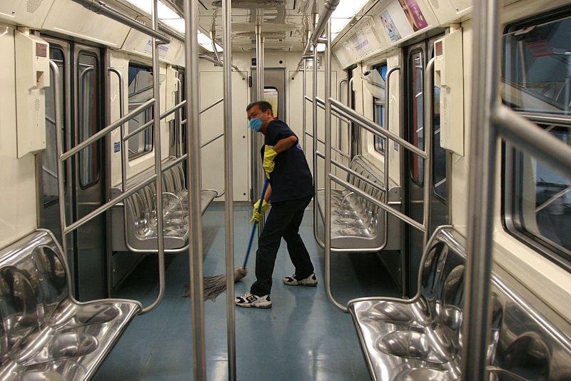 06.05.2009MEX32. CIUDAD DE MÉXICO (MÉXICO), 05/05/09.- Un trabajador del Transporte Colectivo Metro de Ciudad de México limpia uno de los vagones bajo las nuevas medidas sanitarias, en el marco de una cruzada de limpieza y desinfeccion de todo el transporte, restaurantes y escuelas hoy, 5 de mayo de 2009. La capital mexicana llegó a su quinto día consecutivo sin registrar ninguna muerte por la gripe A, causada por el virus AH1N1, informó el secretario de Salud del Distrito Federal, Armando Ahued. EFE/Ricardo CastelanEFE/Ricardo Castelan -