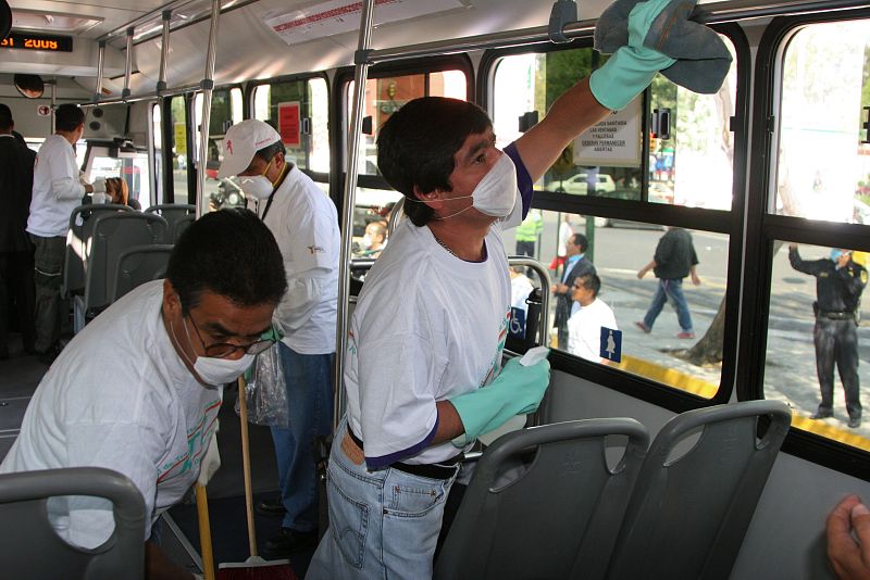 06.05.2009MEX22.CIUDAD DE MÉXICO (MÉXICO), 05/05/09.- Ciudadanos mexicanos emprenden una cruzada de limpieza y desinfección de todos los transportes públicos, restaurantes y escuelas en Ciudad de México hoy, 5 de mayo de 2009, en el marco de las tareas de fumigación por la contingencia ante el virus AH1N1. La capital mexicana llegó a su quinto día consecutivo sin registrar ninguna muerte por la gripe A, informó el secretario de Salud del Distrito Federal, Armando Ahued. EFE/José Méndez EFE/Ricardo CastelanEFE/Ricardo Castelan