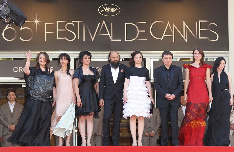19.05.2012(from left) Actors Dana Tapalaga, Victoria Agache, Gina Tandura, Valeriu Andriuta, Cosmina Stratan, Romanian director Cristian Mungiu, Cristina Flutur and actress Catalina Harabagiu pose before the screening of "Dupa Dealuri" (Beyond the Hills) presented in competition at the 65th Cannes film festival on May 19, 2012 in Cannes. AFP PHOTO / VALERY HACHEAFP PHOTO / VALERY HACHE