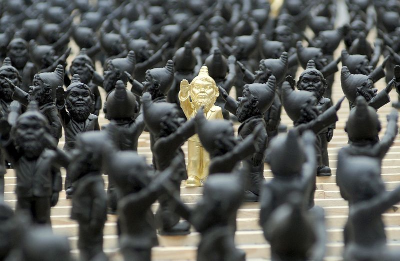 14.10.2009Pequeñas figuras de gnomos haciendo el saludo hitleriano, en la ciudad vieja de Straubing, (Alemania), hoy, 14 de octubre. Con esta polémica instalación, su autor el artista alemán Ottmar Hoerl, pretende alertar contra la manipulación de las masas de las ideas fascistas. Esta instalación está compuesta por 1250 pequeños gnomos. (14/10/09)EFE/Armin Weigel -