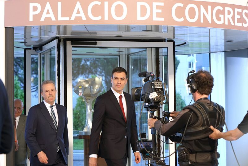 13.06.2016Pedro Sánchez, líder del PSOE y candidato a las elecciones por los socialistas, entra al Palacio Municipal de Congresos de la Feria de Madrid acompañado del presidente de la Academia de Televisión, Manuel Campo Vidal.EFE -