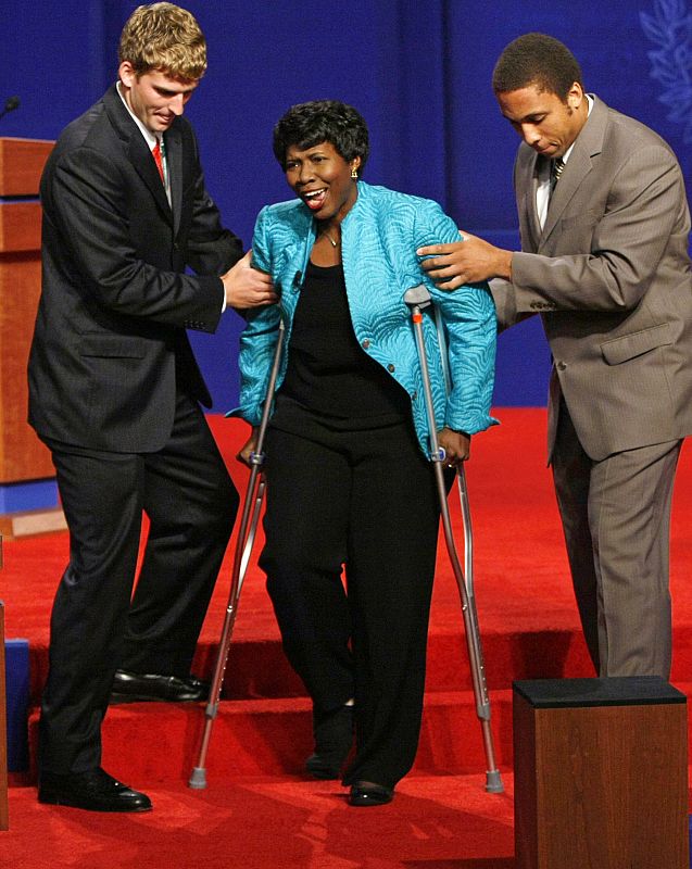 03.10.2008La moderadora del debate vicepresidencial, Gwen Ifill, que se rompió el tobillo esta semana, es ayudada a situarse en el estrado de la universidad de St. Louis (Misuri, 02/10/08).REUTERS/Rick Wilking