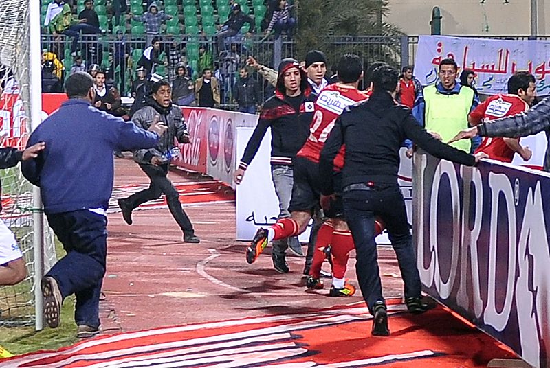 01.02.2012Fans of Al-Masry team run after players of the Al-Ahly team during riots that erupted after the football match between the two teams in Port Said, 220 kms northeast of Cairo, on February 1, 2012. At least 73 people were killed and hundreds injured in the violence that erupted as soon as the referee blew the final whistle in the match. AFP PHOTO/STRmb