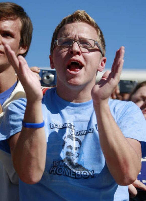 A supporter of U.S. Democratic presidential nominee Senator Barack Obama (D-IL) wearing a t-shirt proclaiming that Obama is his home boy, attends an election rally in Sarasota, Florida, October 30, 2008. Obama is campaigning in Florida, Virginia and Missouri on Thursday before the November 4 presidential election. REUTERS/Jason Reed (UNITED STATES) US PRESIDENTIAL ELECTION CAMPAIGN 2008 (USA)
