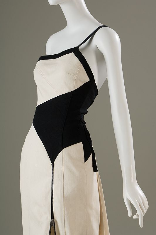 30.11.2015White and black organic tunisian denim one shoulder gown with black denim trim and shoulder strap, pieced black panel at waist, front zippered slit at front L, and pleated white denim deatchable train attached at back .Cortesía del Museum at Fit.