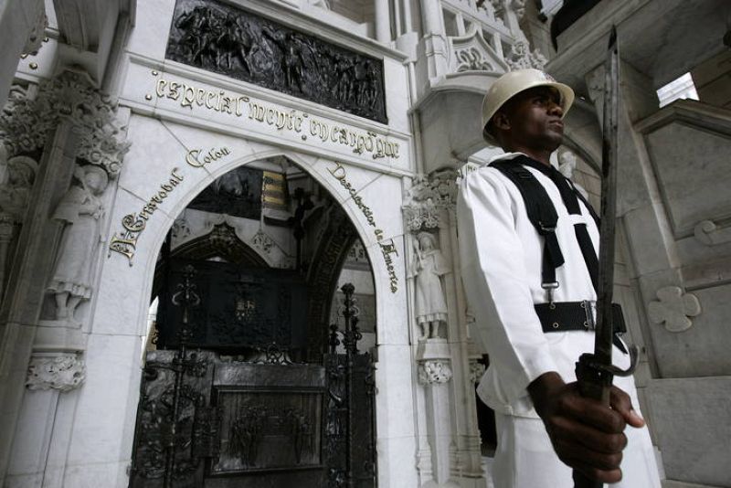 12.10.2009STO01. SANTO DOMINGO (REPÚBLICA DOMINICANA), 11/10/09.- El cabo James Matos, de la Marina de Guerra dominicana, vigila hoy, 11 de octubre del 2009, la urna en la que supuestamente permanecen los restos de Cristóbal Colón, descubridor de América, en Santo Domingo (República Dominicana). Este lunes se cumplen 517 años del descubrimiento del nuevo continente en medio de una polémica entre Sevilla (España) y Santo Domingo (República Dominicana) sobre el lugar donde se encontrarían los restos del marido nacido en Génova, Italia. EFE/Orlando BarríaEFE/Orlando Barría