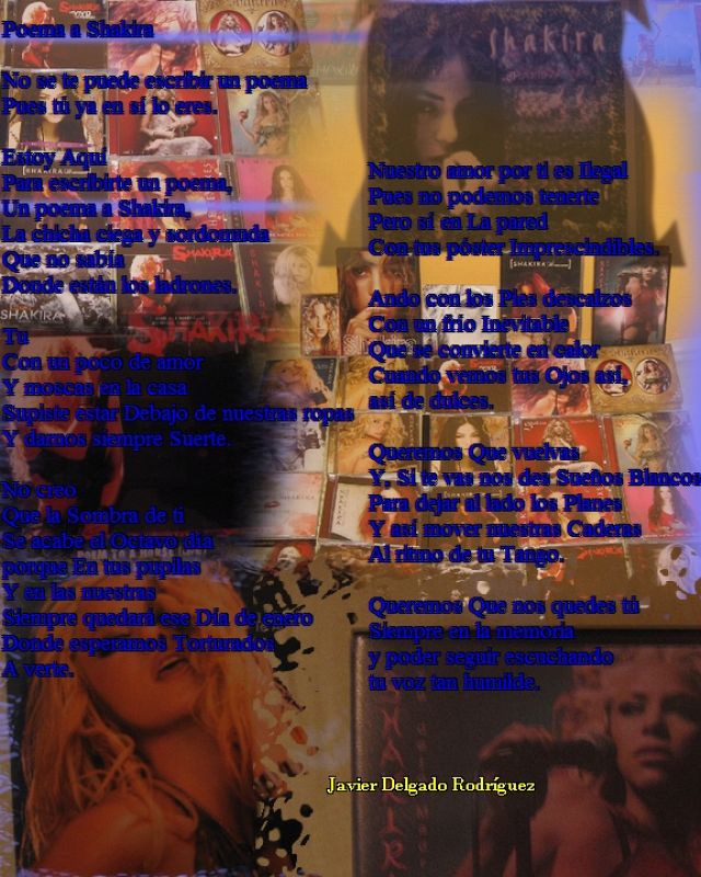 21.09.2009Aqui pongo un poema que escribí a Shakira y parte de mi colección de sus discos. Gracias espero que guste.Javier Delgado