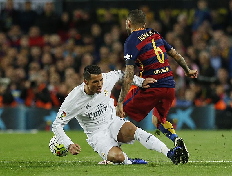 Cristiano Ronaldo, del Madrid, pugna un balón con Dani Alves, del Barça