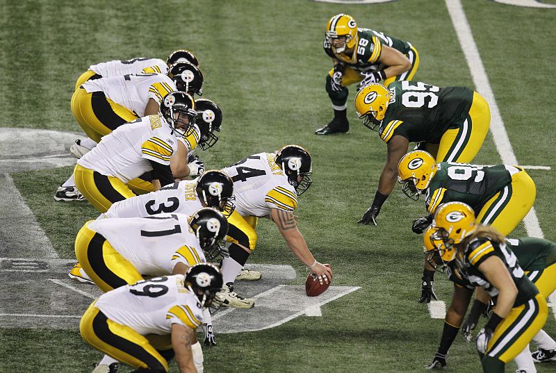 05.02.2011Pittsburgh Steelers quarterback Ben Roethlisberger (L) takes a snap from center Doug Legursky (64) during the NFL's Super Bowl XLV football game against the Green Bay Packers in Arlington, Texas February 6, 2011. REUTERS/Gary Hershorn (UNITED STATES - Tags: SPORT FOOTBALL)REUTERS/Gary Hershorn -