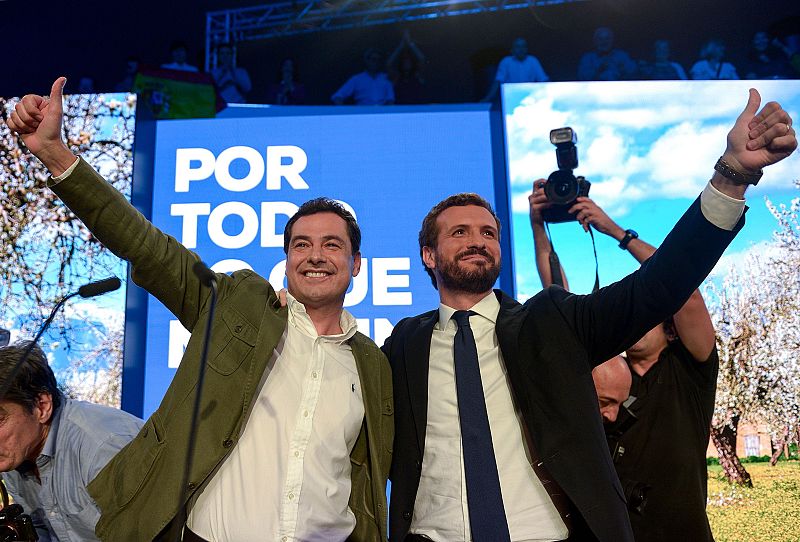 31.10.2019El líder del PP, Pablo Casado (d), junto al presidente de la Junta de Andalucía, Juanma Moreno, durante el acto de inicio de campaña en un hotel de Sevilla.