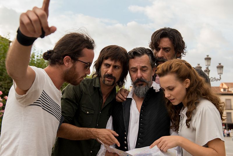 Amelia, Alonso y Pacino se llevan a Cervantes frente a su estatua en la plaza que lleva su nombre.