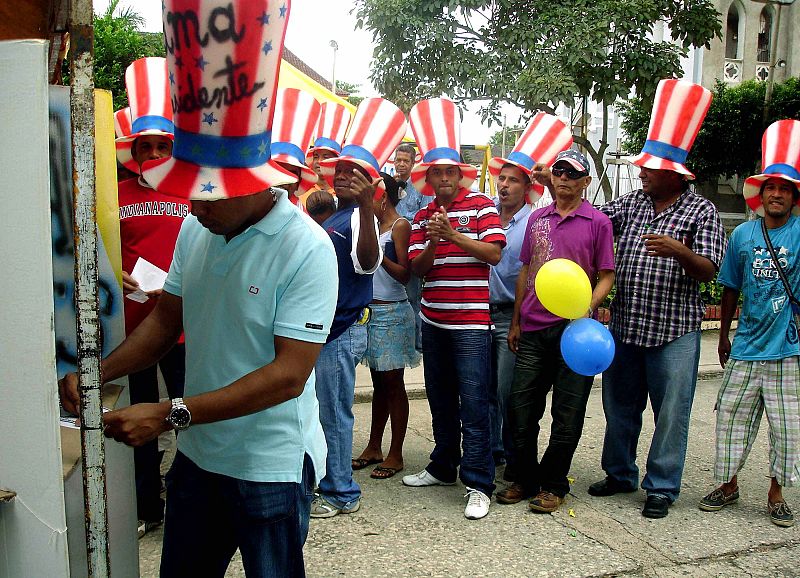 BOG-11. TURBACO (COLOMBIA). 4/11/08.- Habitantes de la población caribeña de Turbaco (Colombia), mayoritariamente afrodescendientes, simulan, hoy 4 de noviembre de 2008, unas votaciones promovidas por simpatizantes del candidato presidencial demócrata de EEUU, Barack Obama, durante el día histórico de elección presidencial en ese país, especialmente si al caer la noche se confirma la designación de Obama como el primer presidente negro. EFE/Str