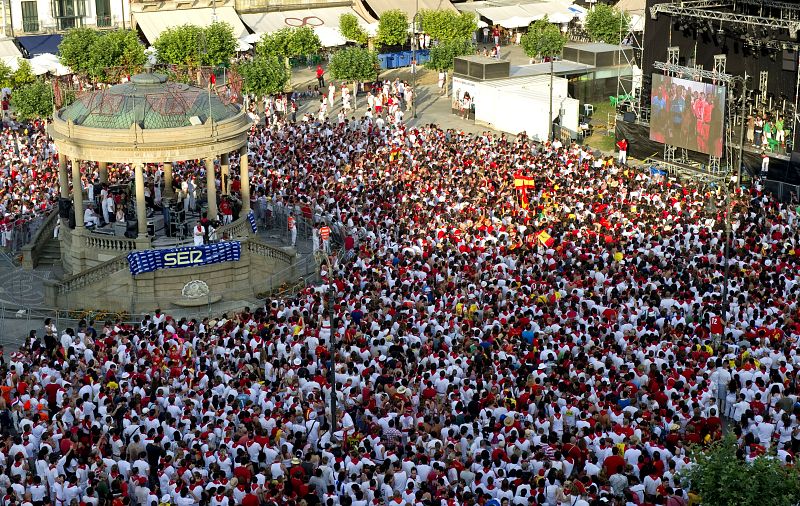 Miles de personas siguen la final del Mundial de fútbol desde la céntrica Plaza del Castillo de Pamplona, ciudad que se encuentra en plenas fiestas de SanFermín.
