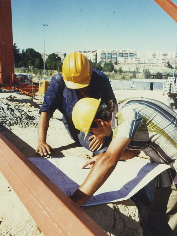 La sombra del fuste del Pirulí sobre las obras del resto de las instalaciones de Torrespaña en una imagen de 1981.