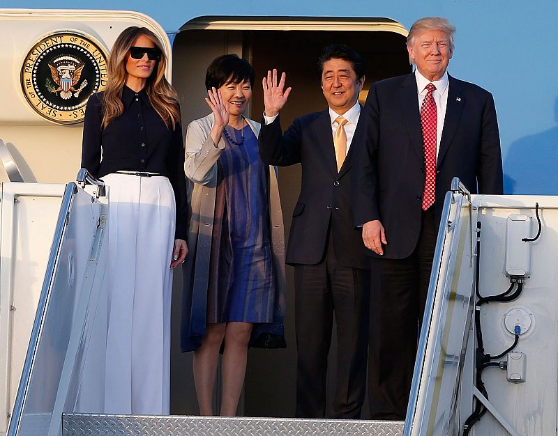 13.01.2018El presidente de EE.UU., Donald Trump, y el primer ministro de Japón, Shinzo Abe, junto a sus respectivas mujeres bajando del Air Force One a su llegada a Palm Beach, Florida, el 10 de febrero de 2017. Trump invitó a Abe a pasar unos días en su residencia Mar-a-Lago.JOE SKIPPER -
